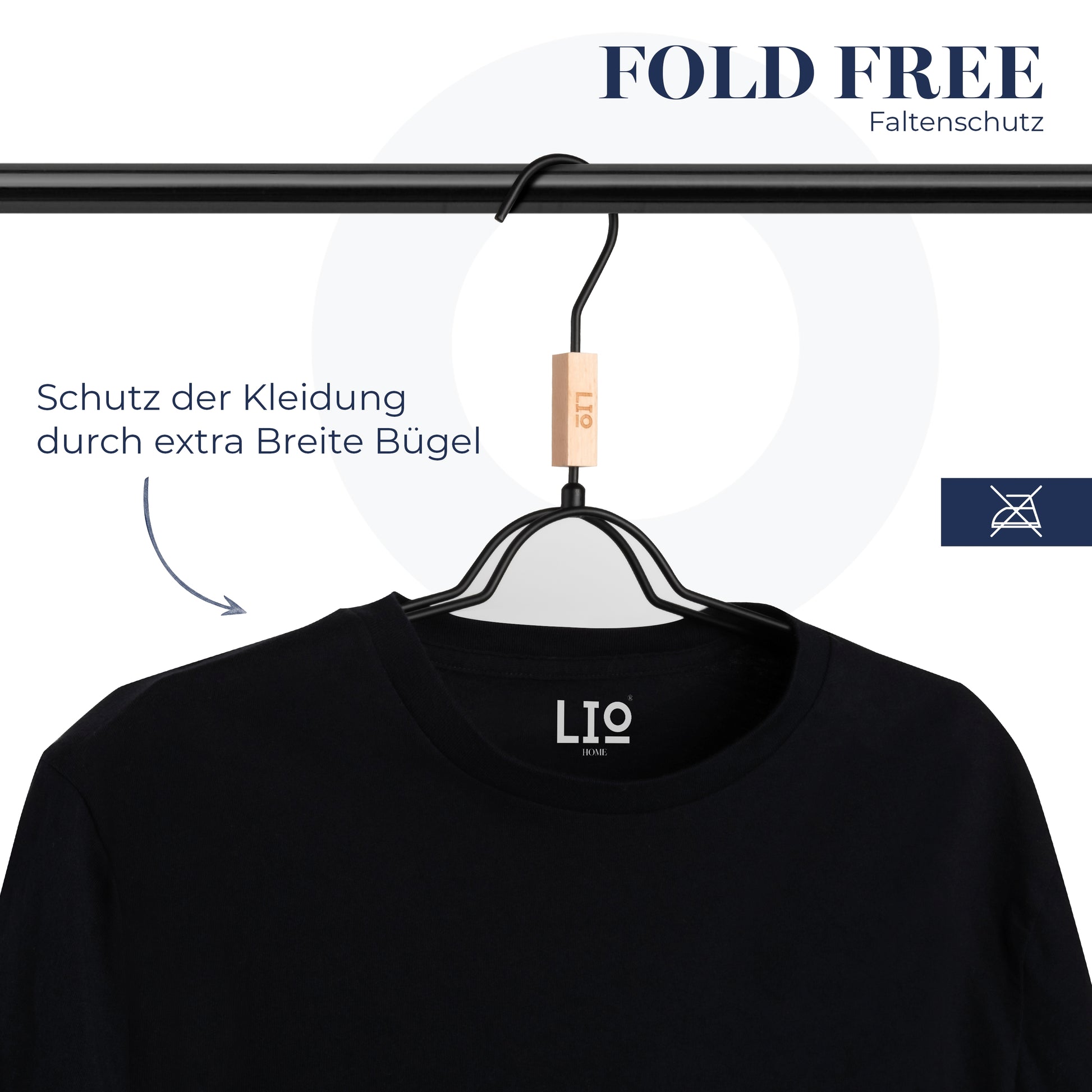 Dank des FoldFree Faltenschutzes sorgen die LIO HOME Kleiderbügel dafür, dass die Form und Struktur Ihrer Kleidung – ob Anzüge, Mäntel oder Blusen – selbst nach langem Hängen makellos erhalten bleiben.